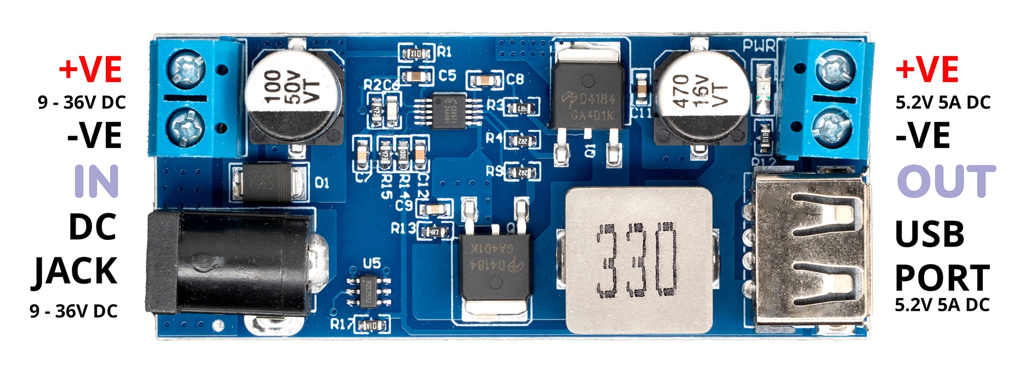 This is a DC to DC step down buck converter module, it operates on a wide input voltage range of 9 to 36 volts DC, delivering an output of 5.2V DC. The module is capable of delivering up to 6A of current (we recommend to limit it to 5A), with the exact output varying based on the input voltage.
