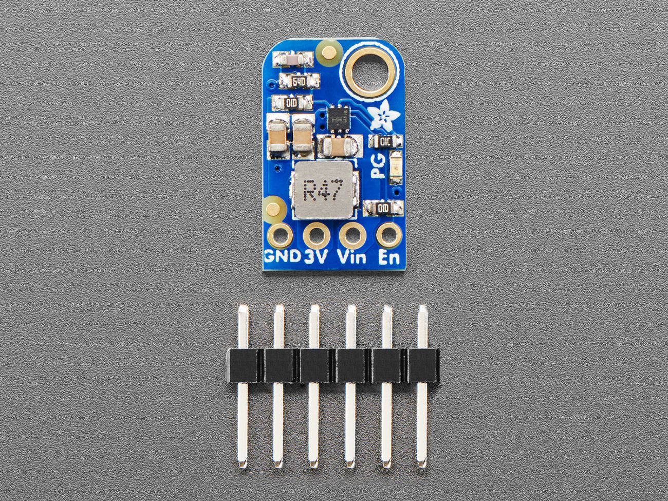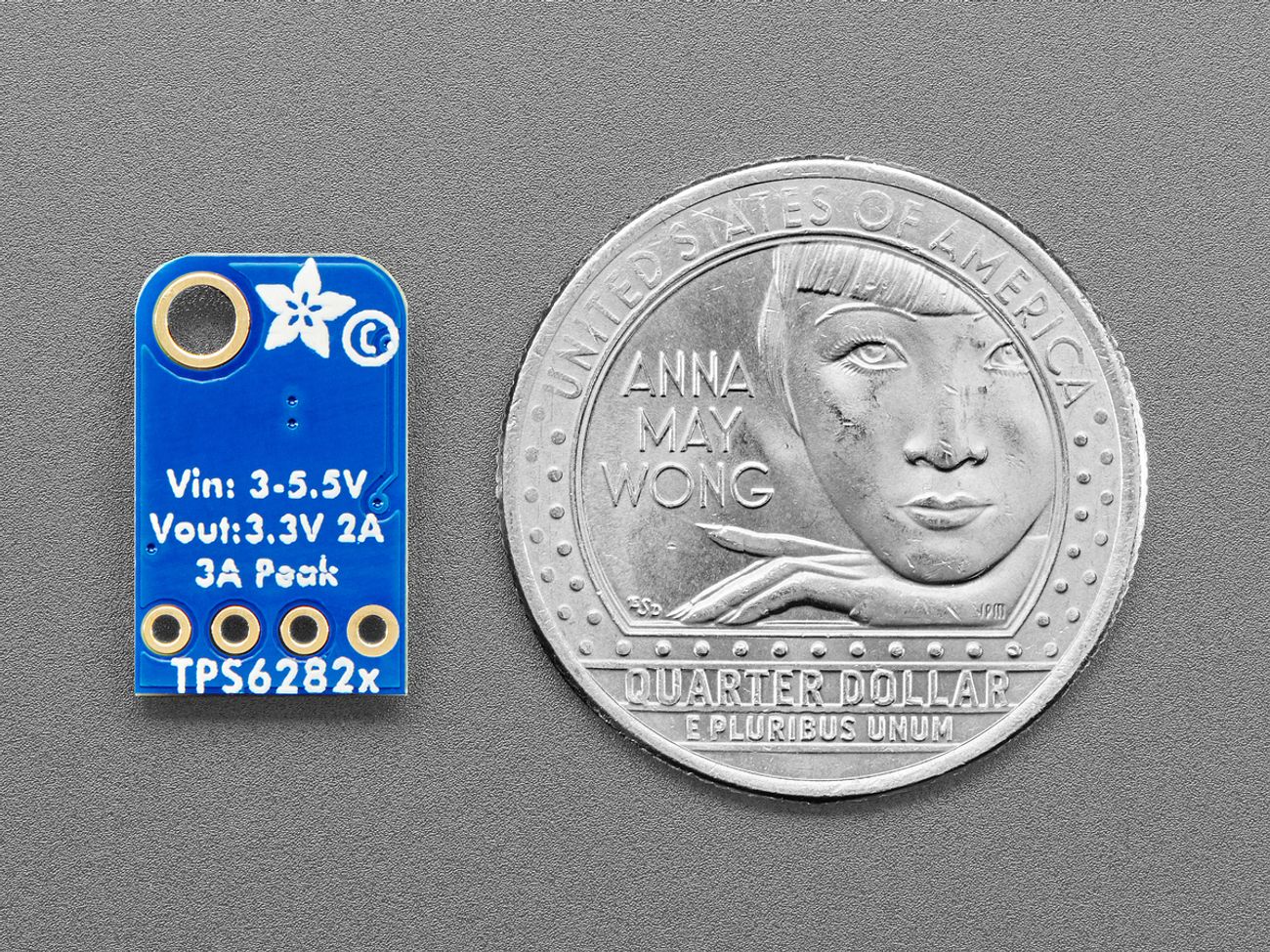 This tiny buck converter breakout is based on the TPS62827 from Texas Instruments and designed by Adafruit to efficiently deliver a fixed 3.3V output at up to 2A from input voltages up to 5.5V. It’s ideal for powering current-hungry 3.3V circuits from LiPo batteries, 3× alkaline cells, or USB power.
