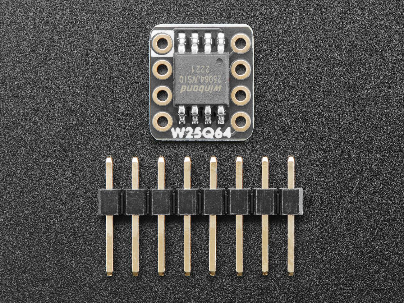 Adafruit QSPI DIP Breakout Board - W25Q64 makes it easy to prototype with external flash memory by converting a wide 8-SOIC package into a breadboard-friendly 0.3" wide DIP format. It is a practical choice for development work with microcontrollers that use external QSPI flash, including boards based on the RP2040, ESP32, NXP RT10xx, and STM32 families.