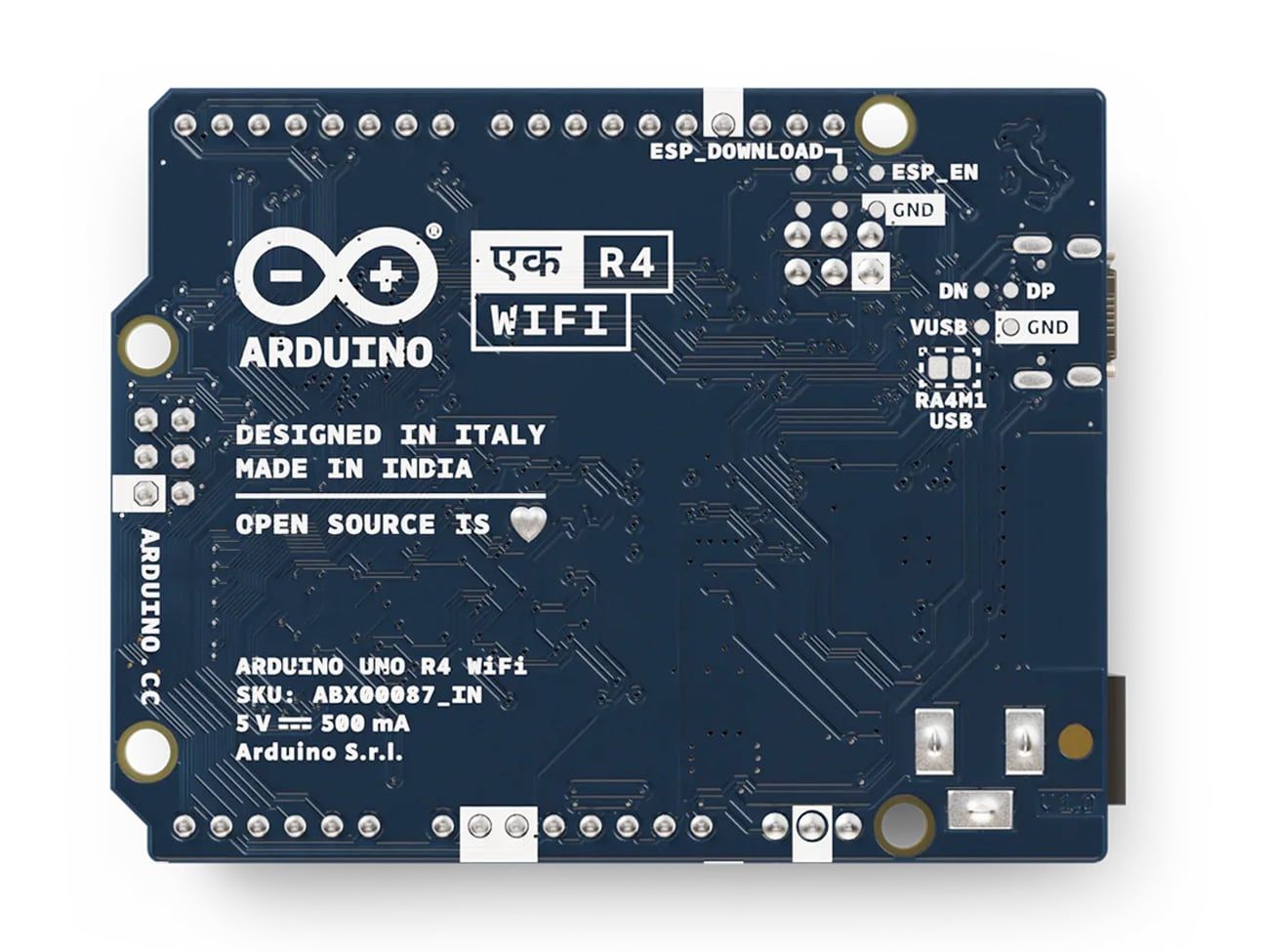 The Arduino UNO Ek R4 WiFi is a latest new upgrade to the popular Arduino UNO R3 board. UNO Ek R4 has the same form factor as the UNO R3 measuring 68.58 x 53.34 mm in dimensions. UNO Ek R4 WiFi comes with a Renesas RA4M1 (Arm® Cortex®-M4) a 32-bit microprocessor clocked at 48 MHz, expanded menory with 32kB of SRAM and 256kB of flash memory and supports 5V operating voltage and also hosts a ESP32-S3 module from Espressif which adds the functionality of wireless connectivity (WiFi and Bluetooth 5.0).