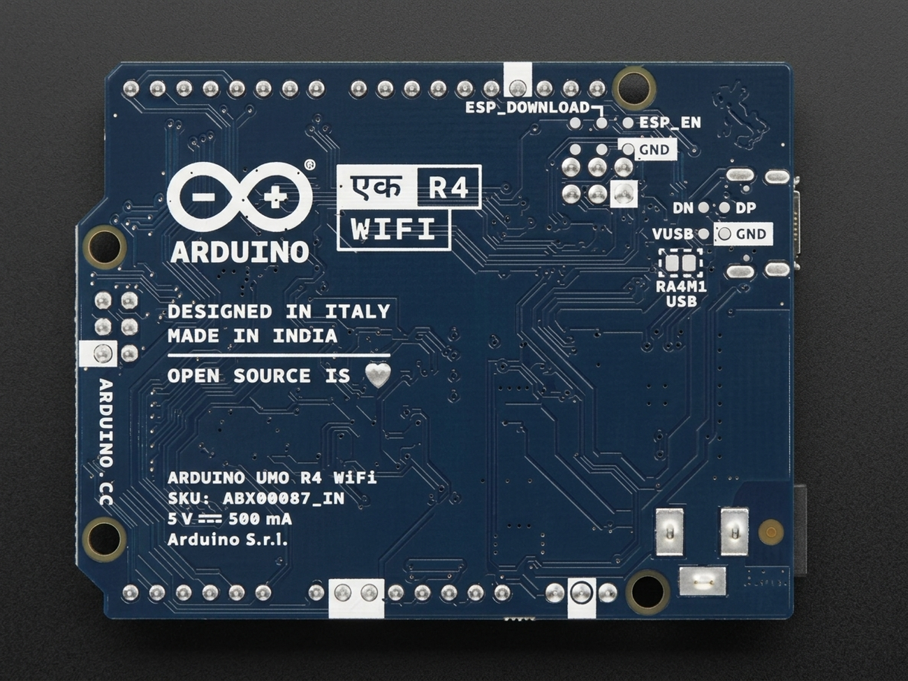 The Arduino UNO Ek R4 WiFi is a latest new upgrade to the popular Arduino UNO R3 board. UNO Ek R4 has the same form factor as the UNO R3 measuring 68.58 x 53.34 mm in dimensions. UNO Ek R4 WiFi comes with a Renesas RA4M1 (Arm® Cortex®-M4) a 32-bit microprocessor clocked at 48 MHz, expanded menory with 32kB of SRAM and 256kB of flash memory and supports 5V operating voltage and also hosts a ESP32-S3 module from Espressif which adds the functionality of wireless connectivity (WiFi and Bluetooth 5.0).