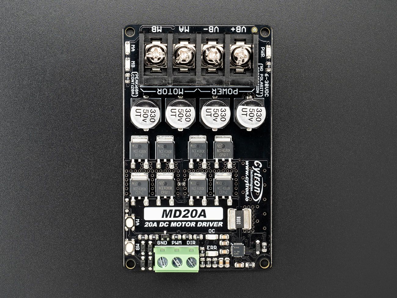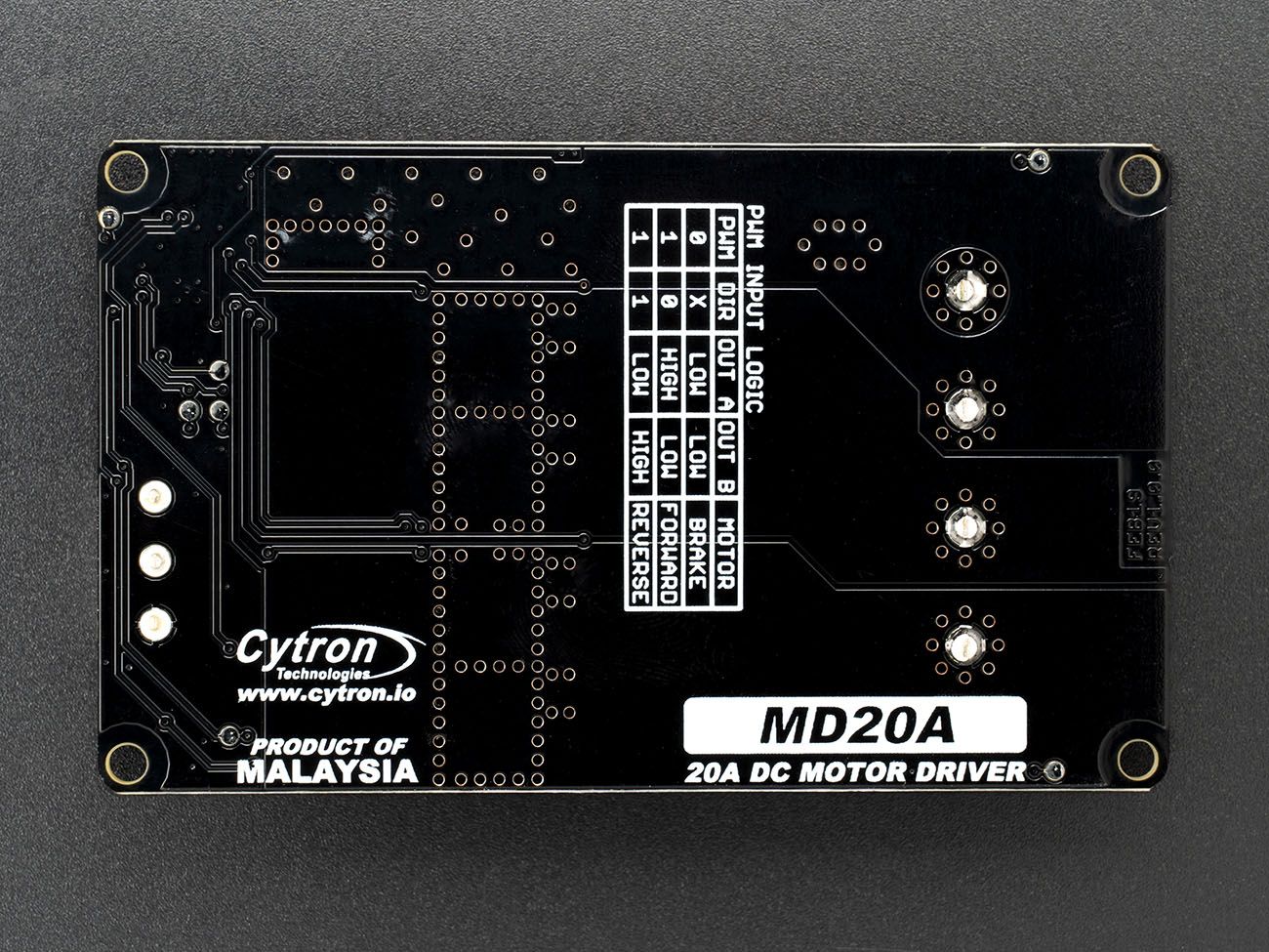The Cytron MD20A is a bi-directional, single channel motor driver for controlling a single high-power brushed DC motor, raging from 6V to 30V and rated for 20A of continuous current and 60A of peak current without the need of a heatsink, Its NMOS H-Bridge design makes its efficient in handling high amount of current.