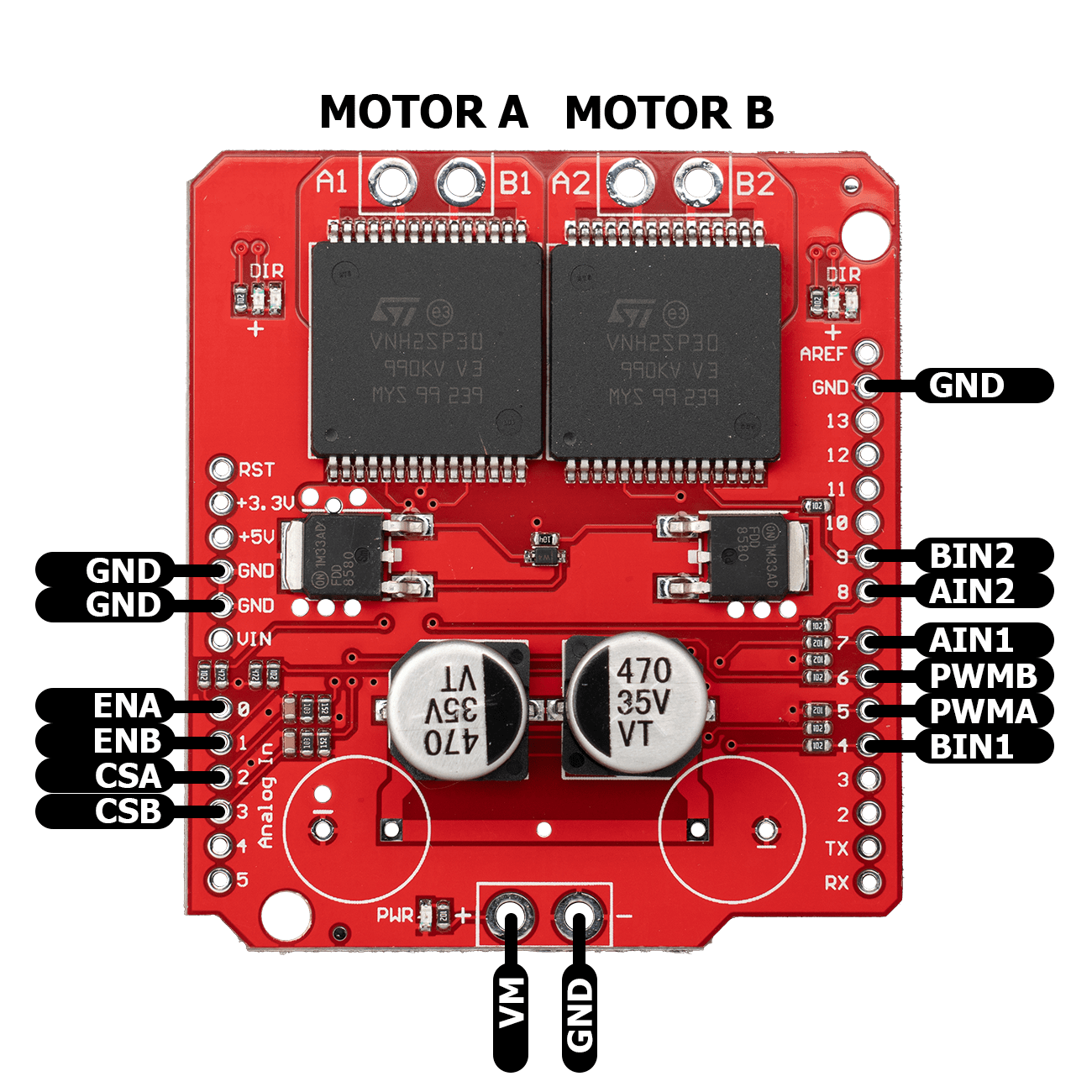 Pinouts for VNH3ASP30 Monster Moto Shield for Arduino UNO.
