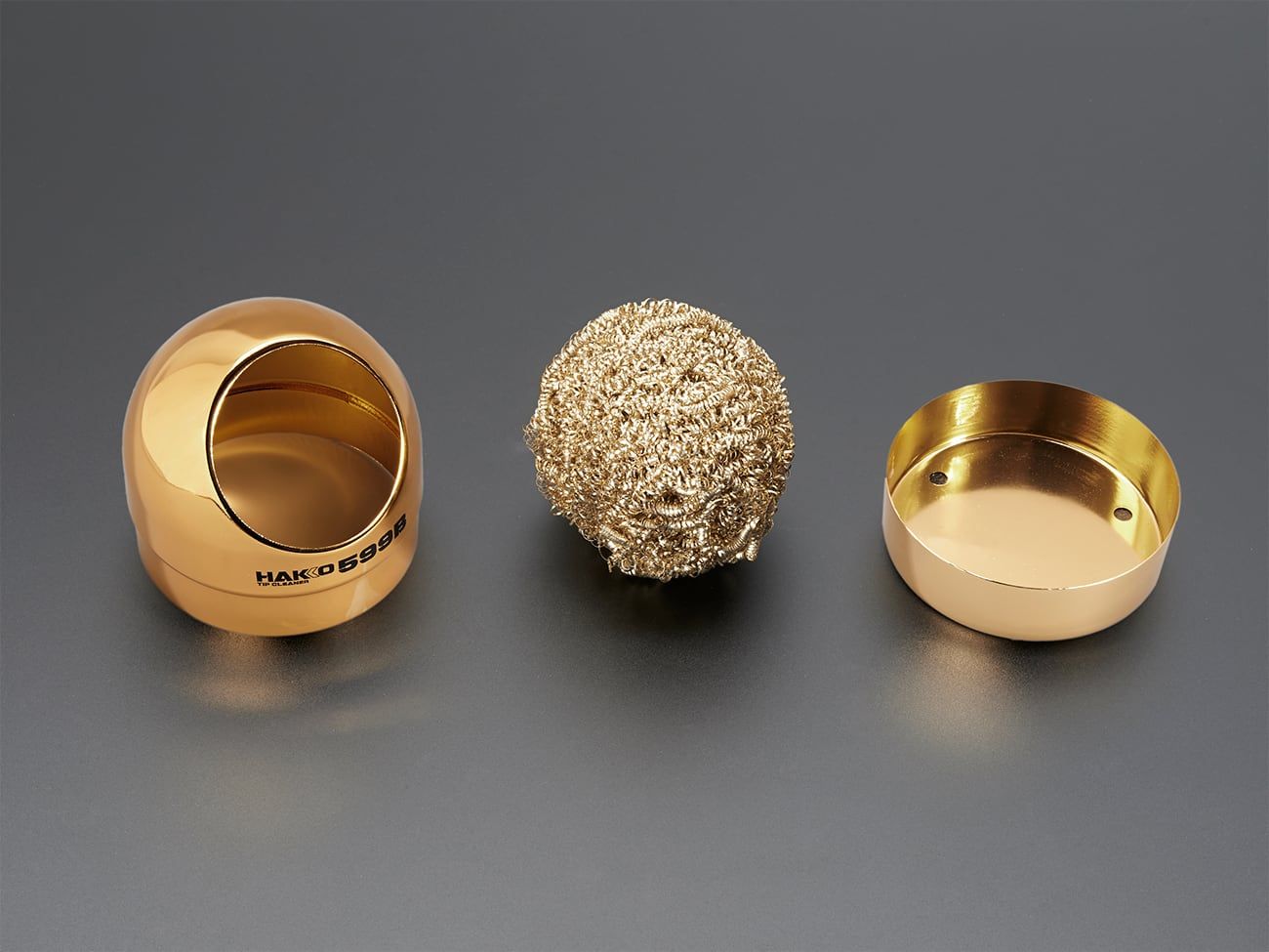 The HAKKO 599B brass sponge solder tip cleaner uses coiled brass wire to efficiently clean soldering iron tips especially when using lead-free solder without water. This minimizes temperature drop and improves work efficiency compared to traditional wet sponges.