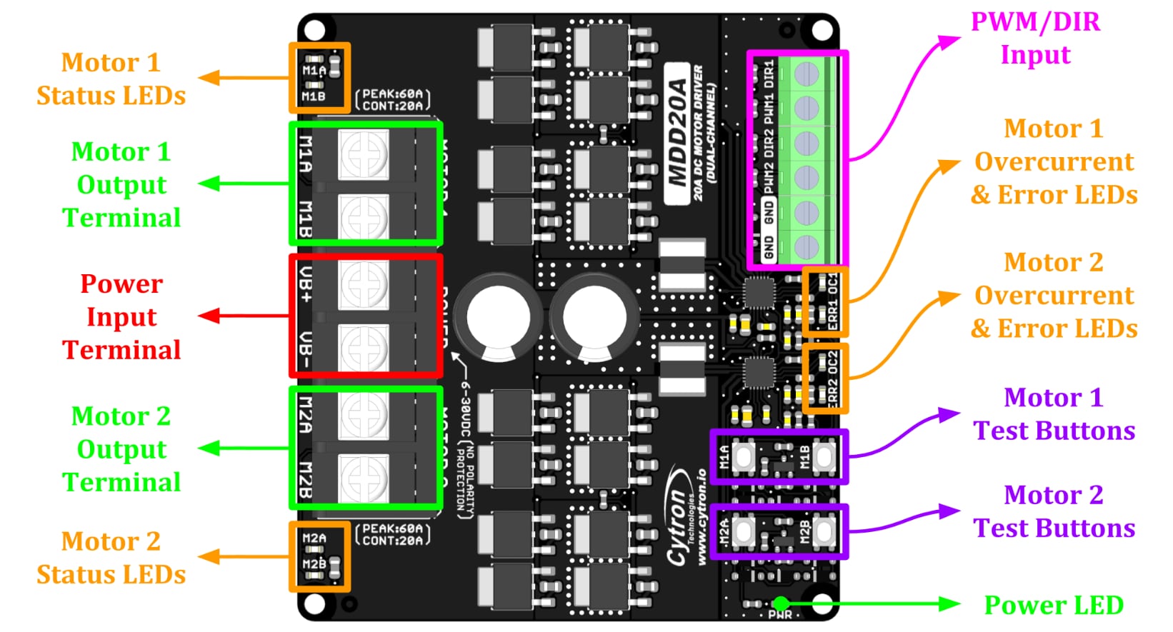 Pinout and layout for Cytron MDD20A Dual Channel Motor Driver.