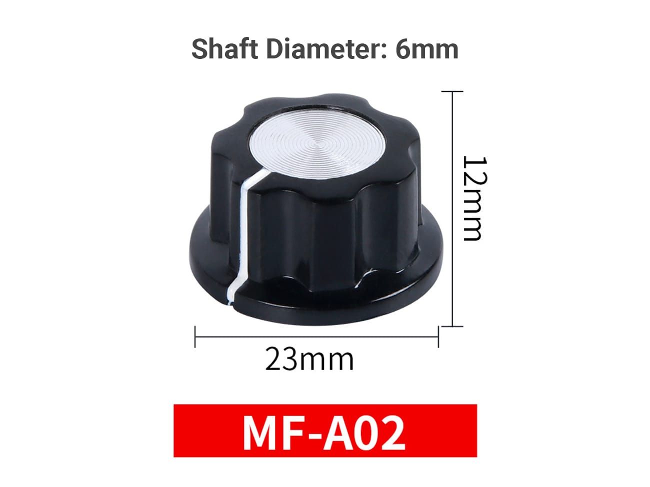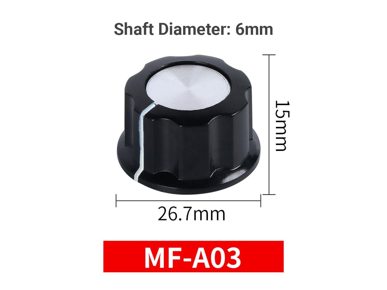 MF-A01, MF-A02, MF-A03, MF-A04, and MF-A05 are rotary potentiometer knobs/caps with 6mm shaft hole diameter. These knobs connect to a rotating potentiometer "pot" or rotary switches, allowing for a smooth clockwise and counterclockwise rotation. This smooth turning action moves a sliding contact inside the pot, which can be used to control various functions like volume, brightness, or speed.