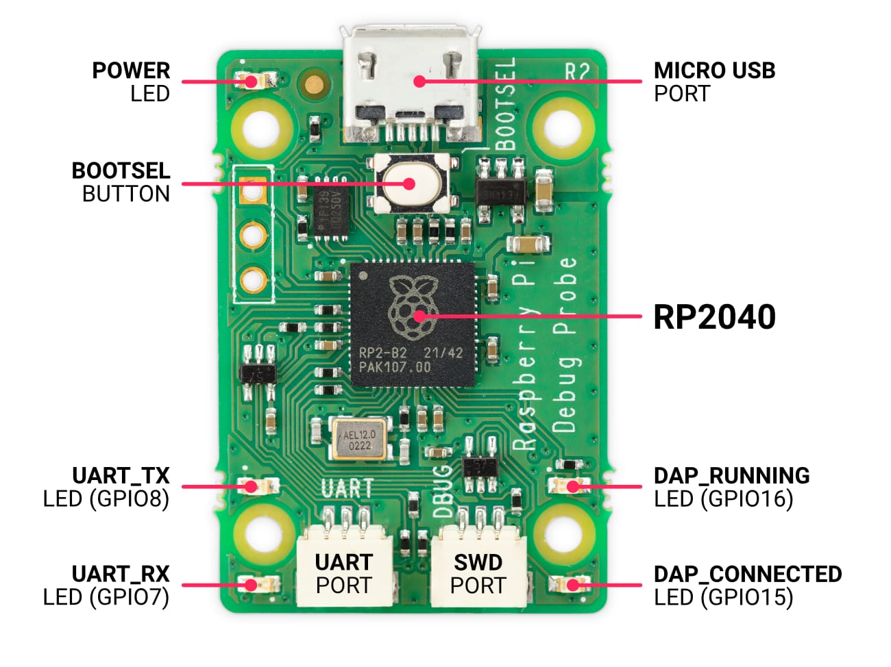 It comes with two debugging interfaces, SWD (Serial Wire Debug) and UART (Universal Asynchronous Receiver Transmitter). Both interfaces use the Raspberry Pi 3-pin debug connector, making it simple to connect.
