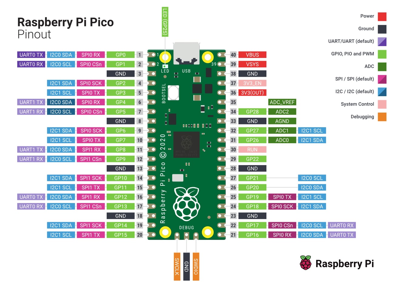 Pico has extensive I/O capabilities with 26 GPIO Pins, including 3 Analog Inputs and lots of interfacing options including 2 × SPI, 2 × I2C, 2 × UART, 3 × 12-bit ADC, 16 × controllable PWM channels. Moreover, 26 of the GPIO pins are multi-function, which means we can configure those pins to a different behavior like UART/I2C/SPI/GPIO.